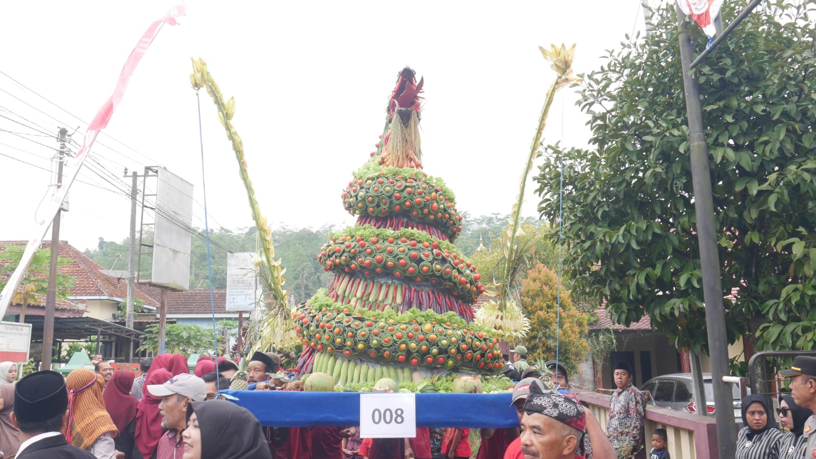Gunungan yang berisi hasil bumi berupa sayuran, buah-buahan, hingga palawija disusun dengan indah oleh warga. Tradisi ini menjadi simbol rasa syukur masyarakat atas rezeki dan panen yang melimpah, sekaligus wujud kebersamaan dalam menjaga tradisi leluhur.